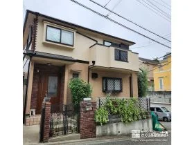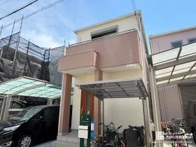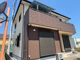 安定感のある寄棟屋根です。屋根色や破風板には、柔らかい雰囲気のブラウンを使用しています。軒天はホワイト、鼻隠しはブラウンの色味で分けています。色味の組み合わせが素敵な外観デザインに仕上がっています。