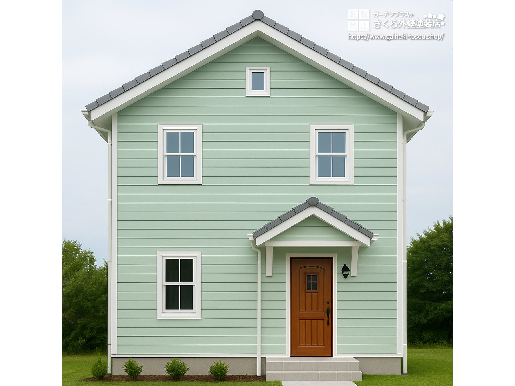 グリーンの外壁は、明るさやトーンで印象が大きく変わる万能カラー。素材や屋根の色との組み合わせで、上品にも個性的にも仕上げることができます。