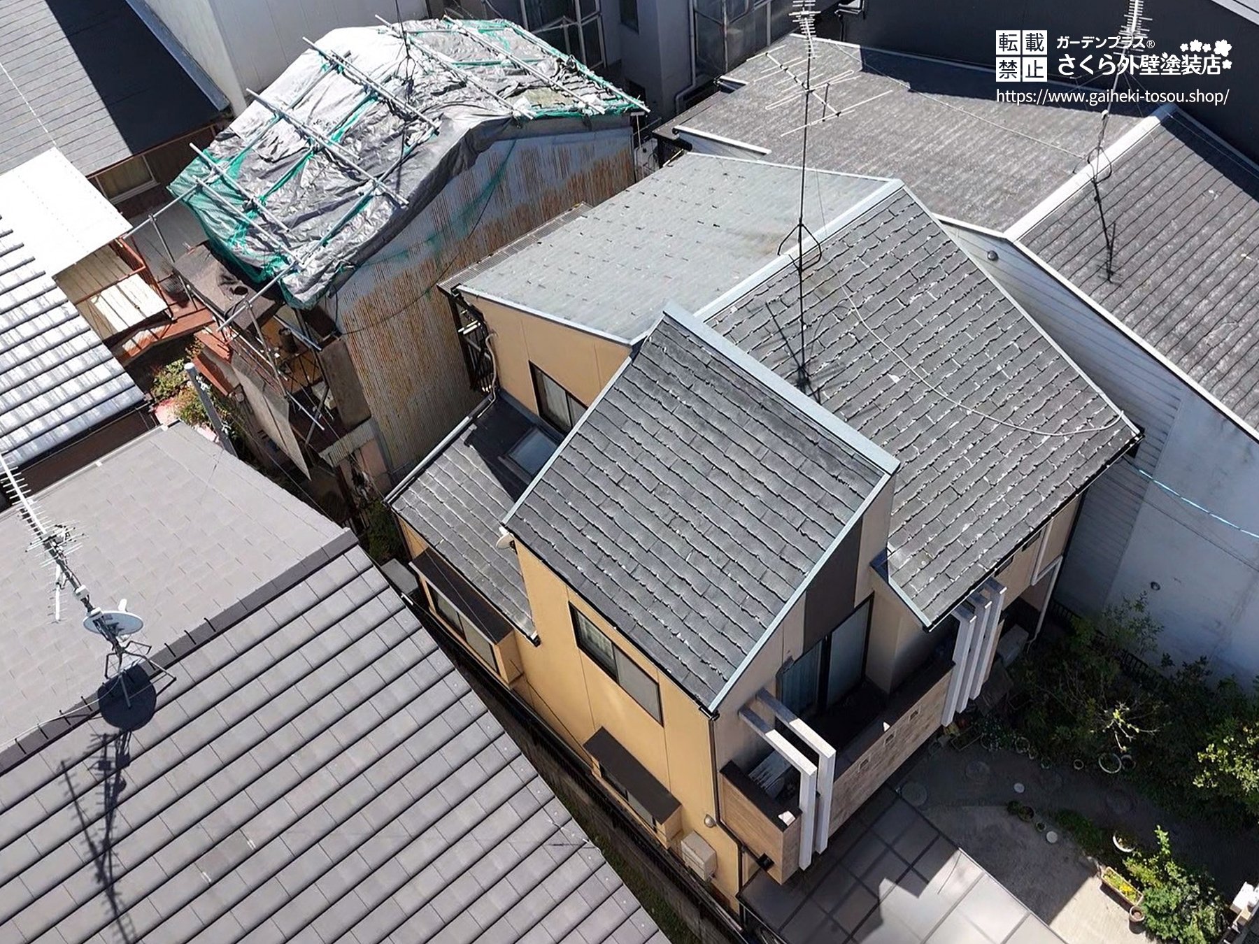 周囲の建物の屋根と比べても劣化しているのがよく分かりますね。