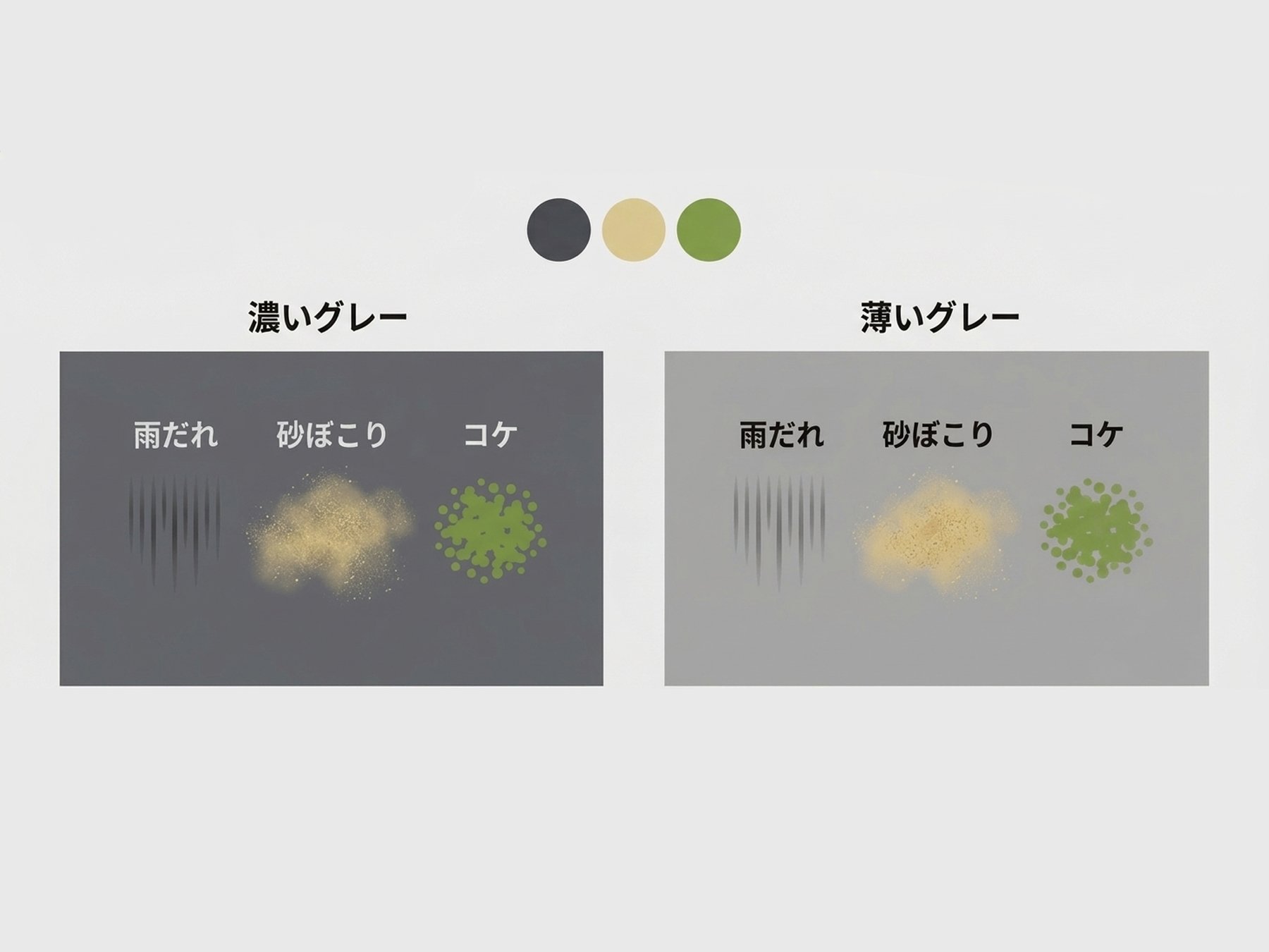 外壁を汚す「砂埃(黄)」「苔(緑)」「排気ガス(黒)」は、すべて彩度が低い中間色です。グレーはこれらすべての色味を内包しているため、汚れが付着しても外壁の色と同化し、驚くほど馴染んでしまいます。