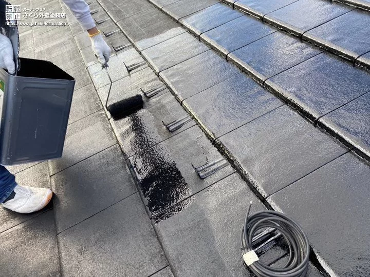 屋根には、ハイルーフマイルドシリコン塗料を採用。色味は、以前と同じ重厚感のあるブラックカラーであしらいました。
