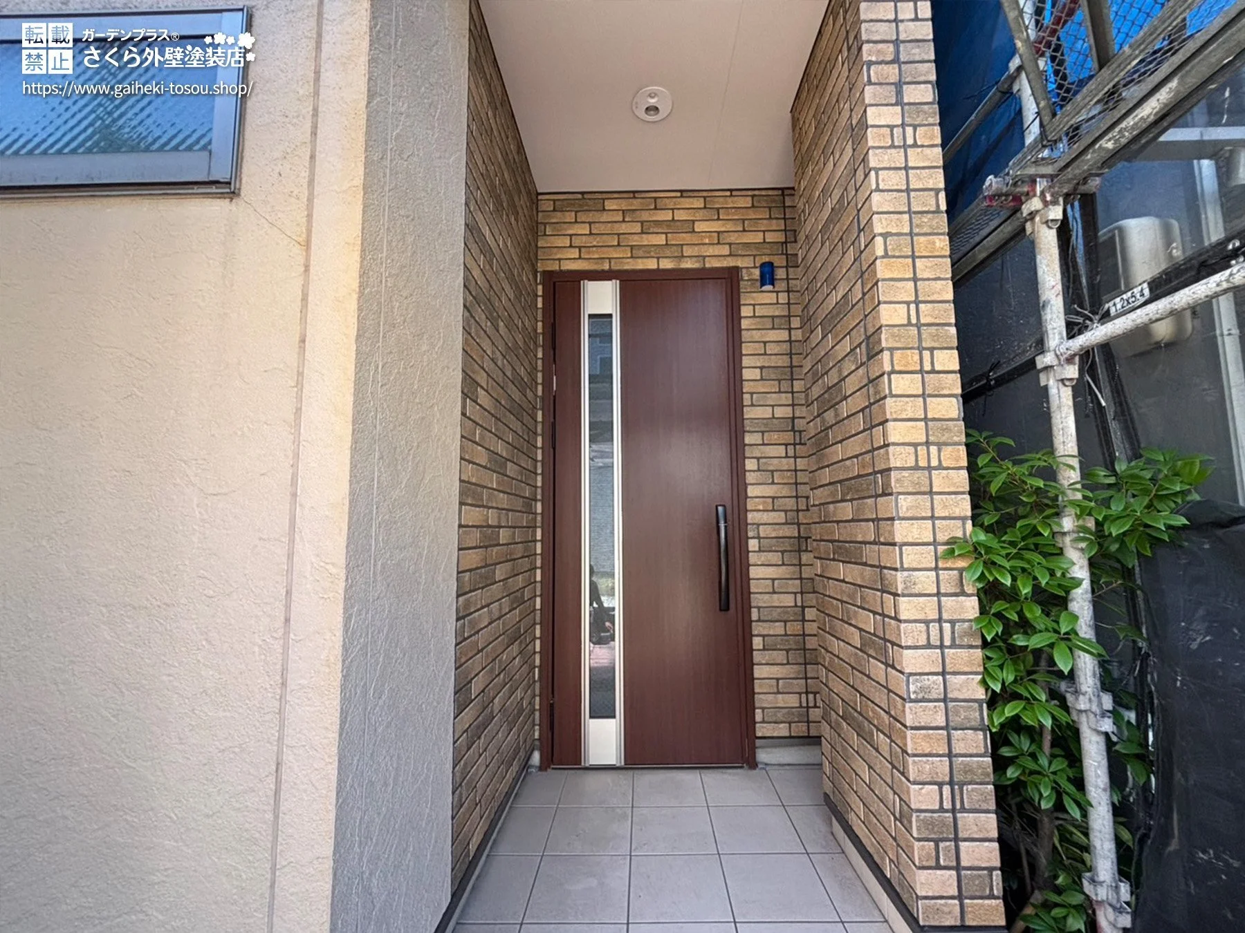 元々ベージュとレンガ調の外壁デザインだったお住まいに、ベージュ部分には「グランセラ™トップ 1液水性」の無機塗料を採用。レンガ部分には「UVプロテクトクリヤー」を塗装しました。