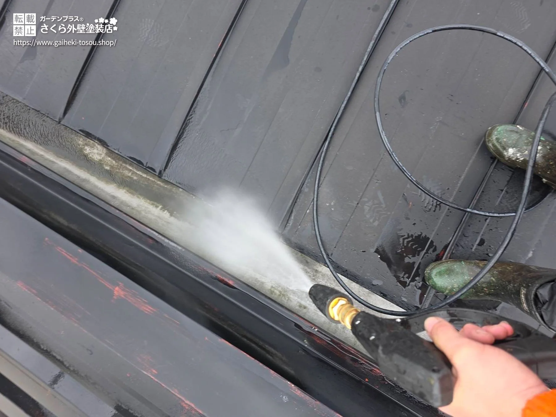 古い塗膜や表面に生えたカビやコケ、汚れなどが残ったままだと、新たな塗膜が十分な性能を発揮できないため高圧洗浄にて洗い落とします。