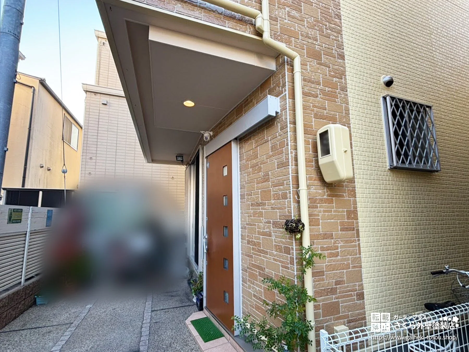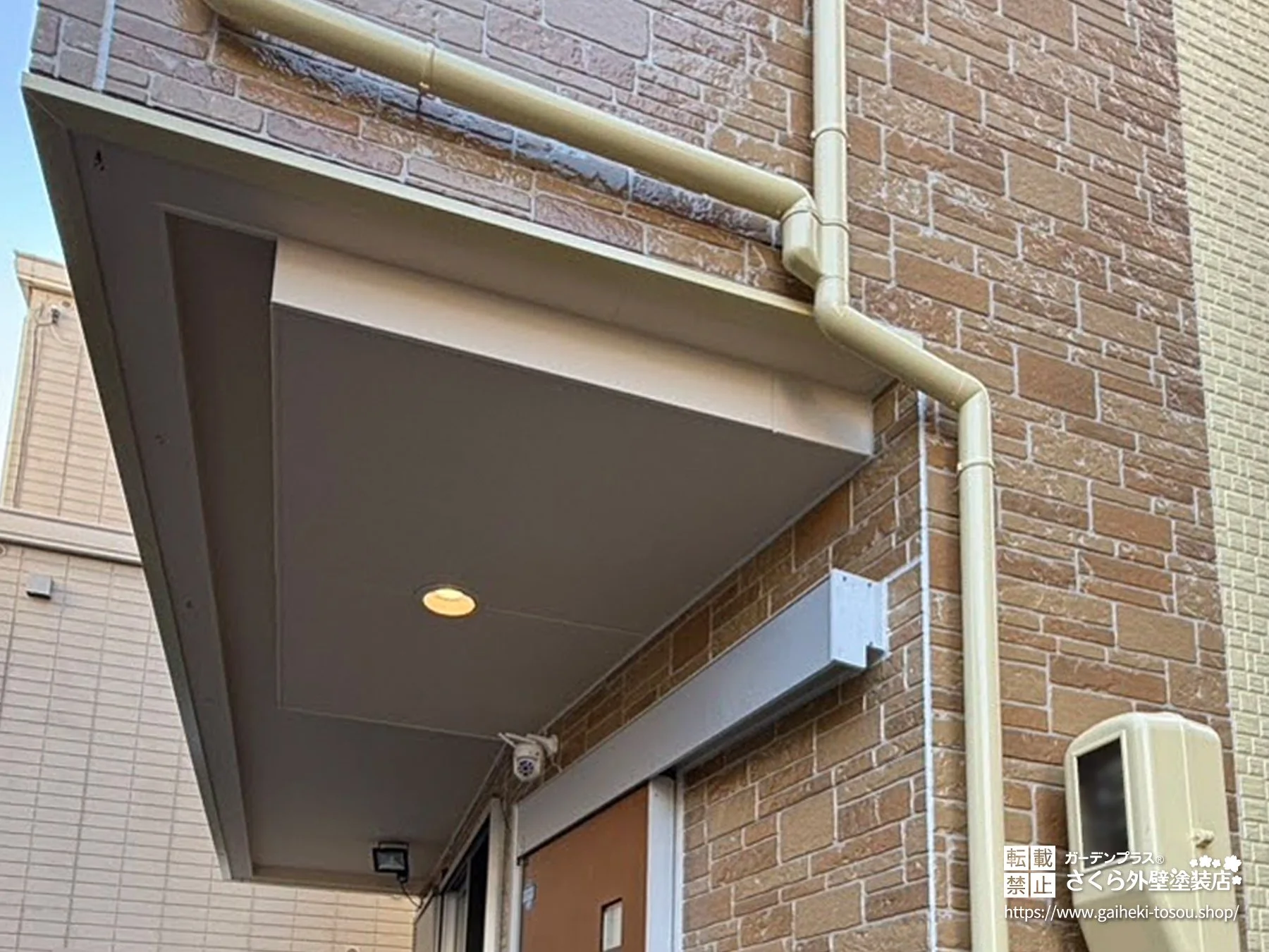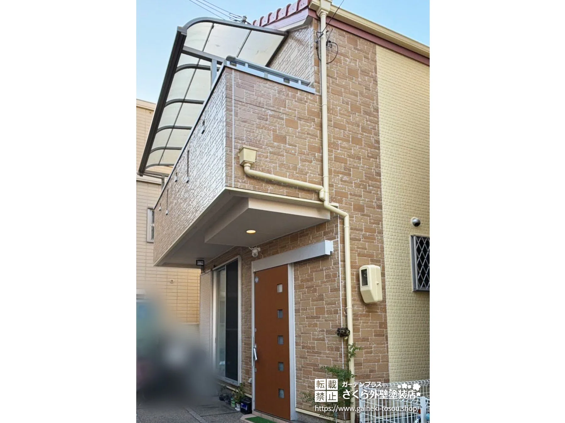 元の外壁デザインを活かし、クリアー塗装とクリーム色で美しく仕上げました。