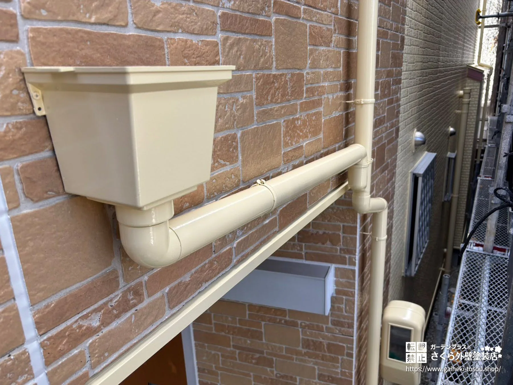 その他、高圧洗浄、シーリングの打ち替え、破風板・雨樋・雨戸・水切り金物などの付帯部や、バルコニー床塗装まで丁寧に施工。付帯部はクリーム、雨戸はホワイトで、明るく清潔感のある外観に仕上げています。