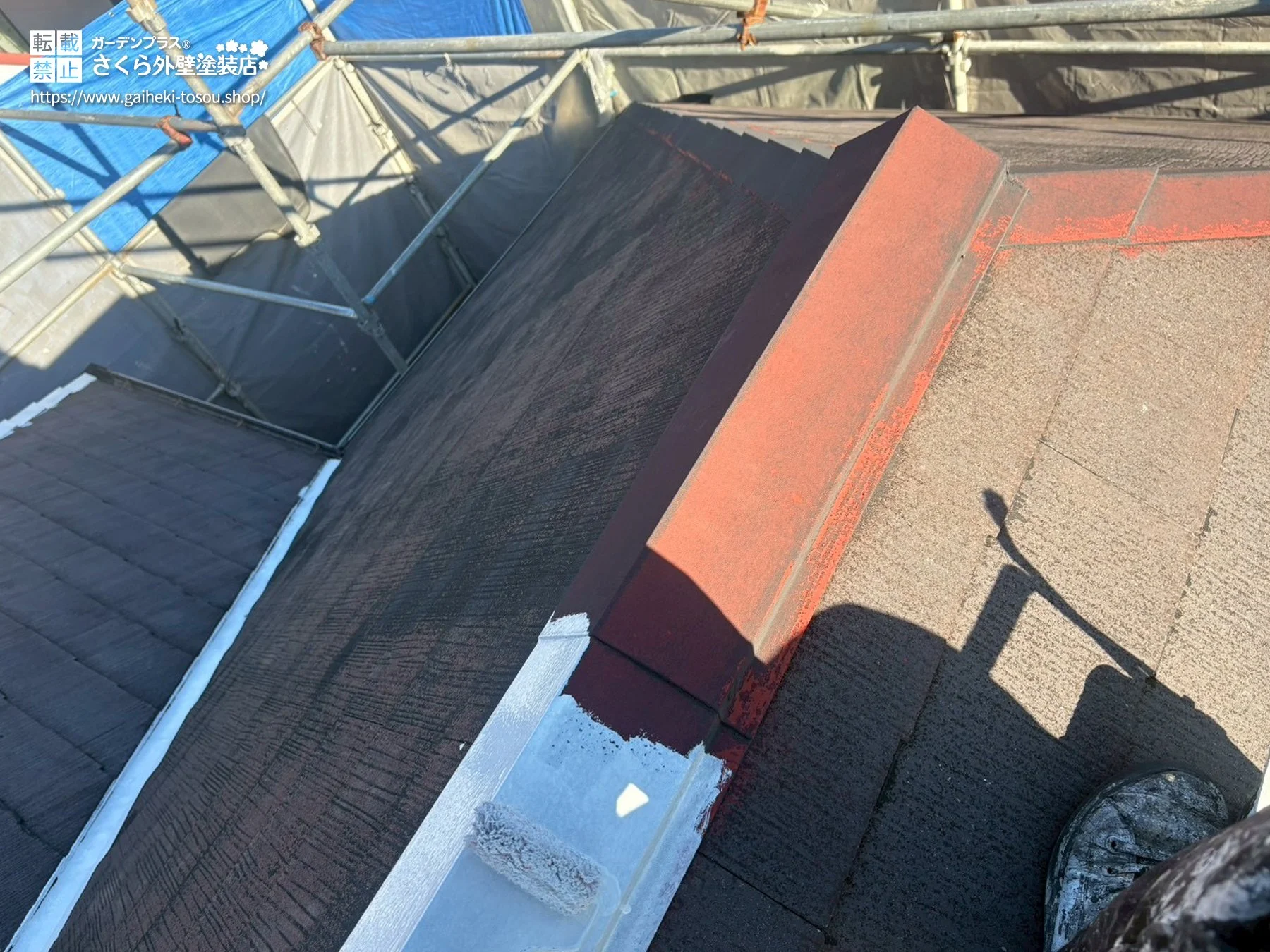 屋根には、日本ペイントの「グランセラベスト2液ファイン」を使用し、下地処理から仕上げまで丁寧に施工。優れた耐候性と遮熱性能を備えた塗料により、屋根の保護性能を高めてくれます。