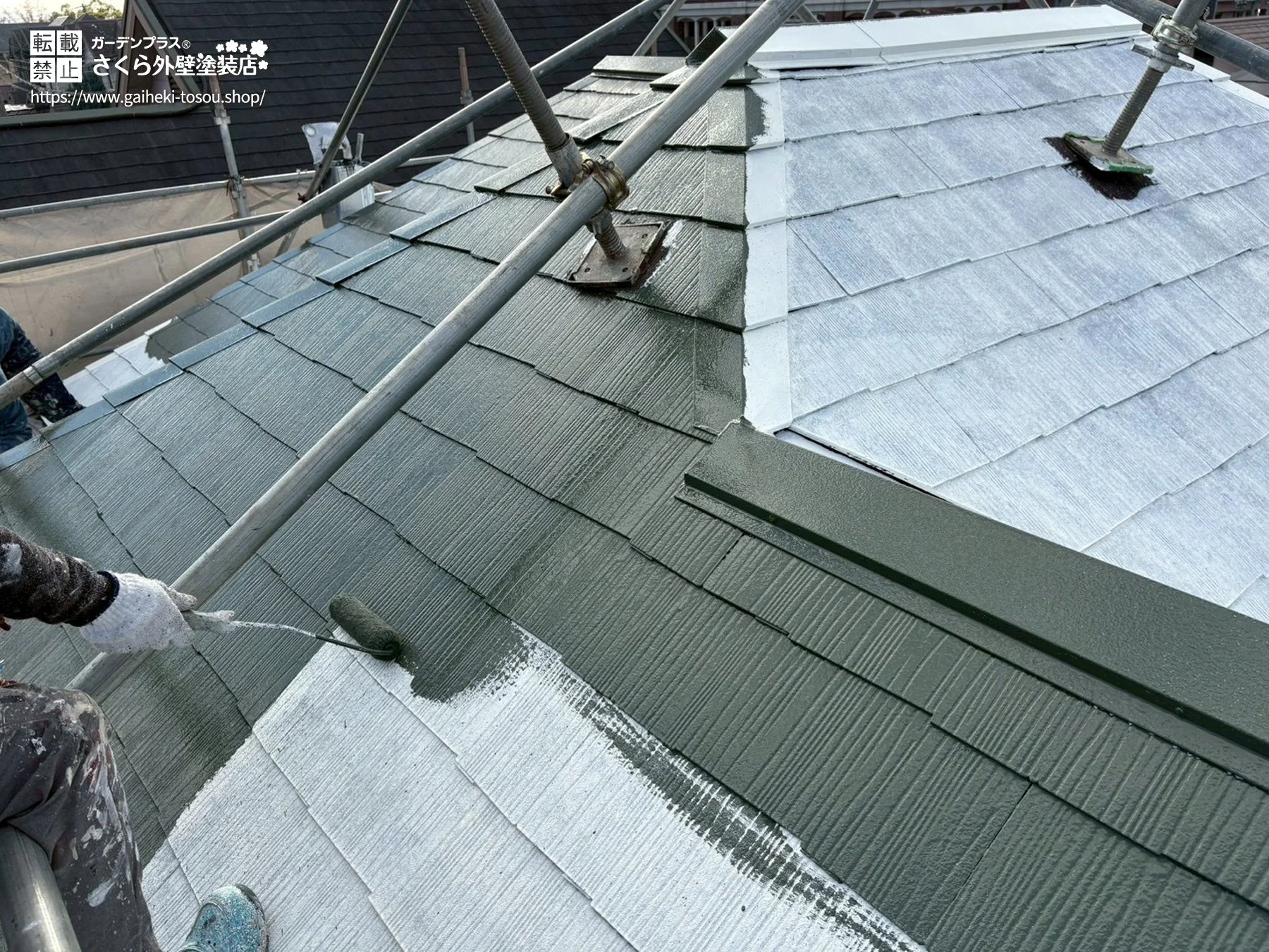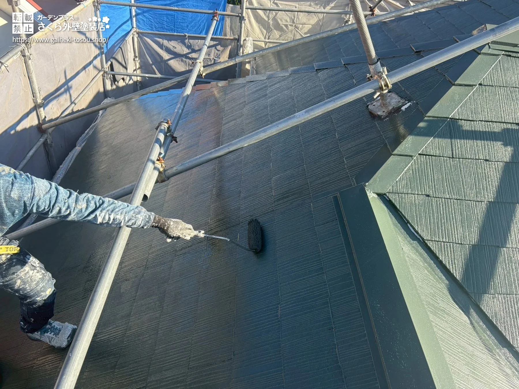 ![屋根塗装・続き 下地処理を行ったうえで、落ち着いたグリーンに仕上げた屋根塗装の様子。[上塗り] 屋根塗装・続き 下地処理を行ったうえで、落ち着いたグリーンに仕上げた屋根塗装の様子。[上塗り]](/public/img/construction/593/point4_other1_s.webp)