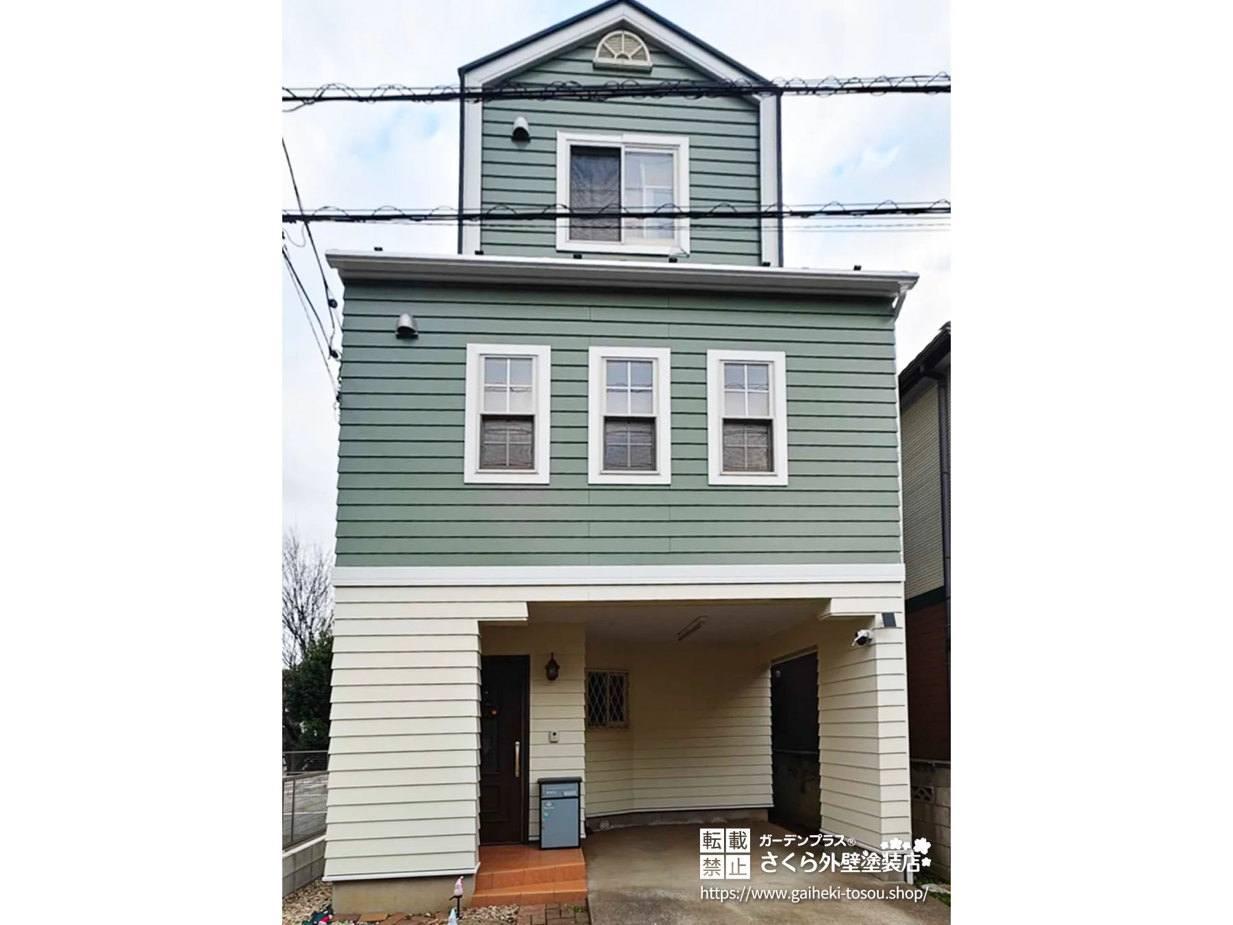 落ち着きのあるグリーンが主張しすぎることなく、付帯部のホワイトとも自然になじみ、建物全体が統一感のある仕上がりに。上下のコントラストが程よいメリハリを生み、やわらかさと清潔感を兼ね備えた印象となりました。