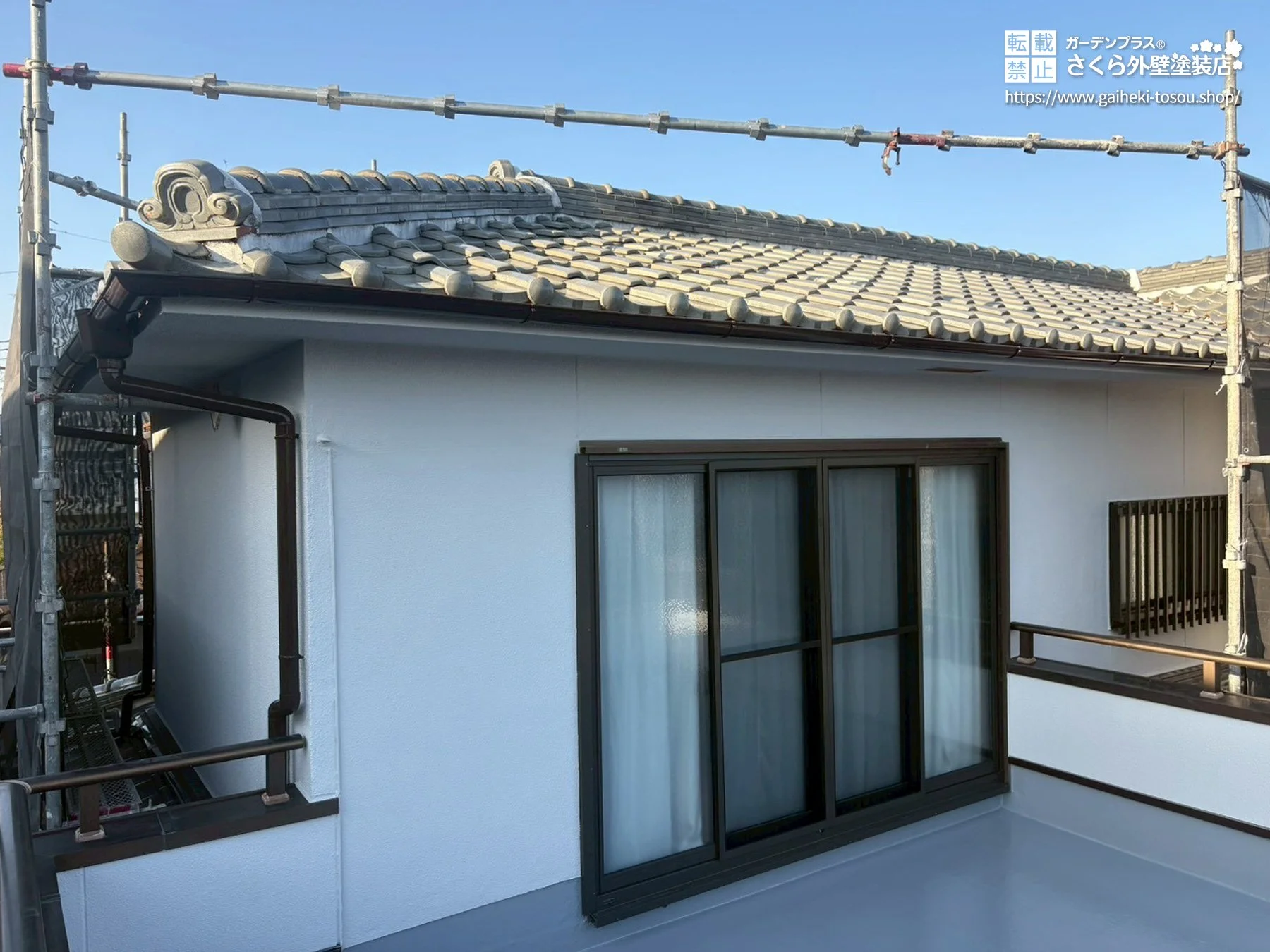 カラーは、外壁をオフホワイト、ベランダ部分のみ青みがかったグレーで仕上げたツートン配色。アクセントカラーが程よく効き、和風住宅の佇まいにモダンな要素を取り入れた、洗練された外観に。全体がすっきりと引き締まり、爽やかでクールな印象へと生まれ変わりました。