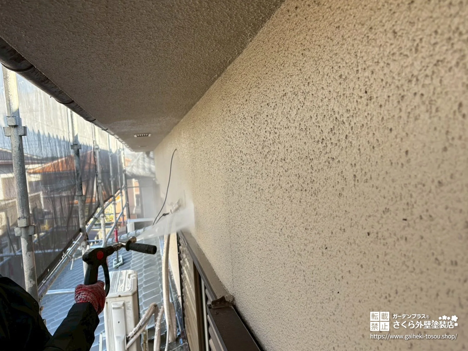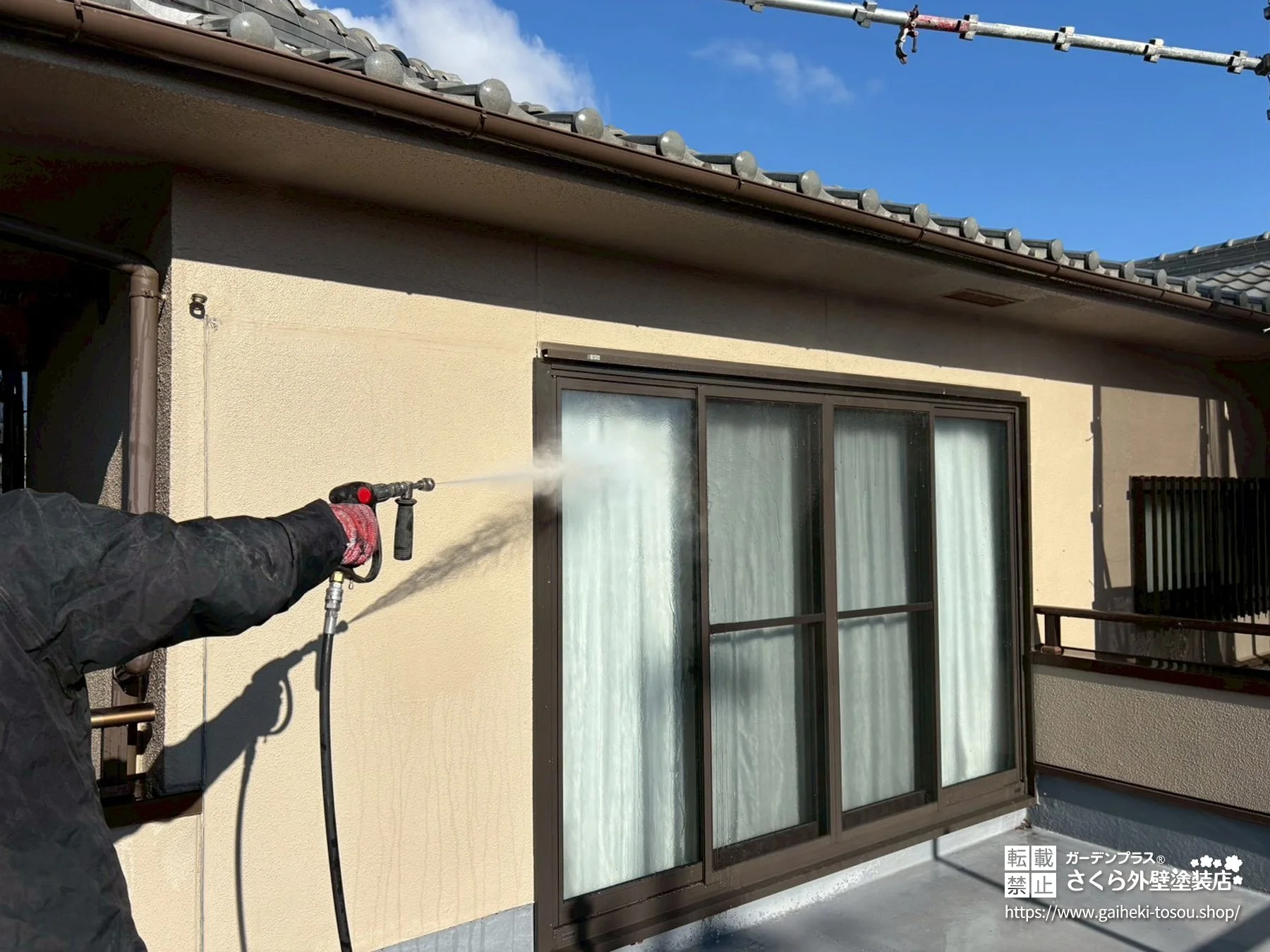 古い塗膜や表面に生えたカビやコケ、汚れなどが残ったままだと、新たな塗膜が十分な性能を発揮できないため高圧洗浄にて洗い落とします。