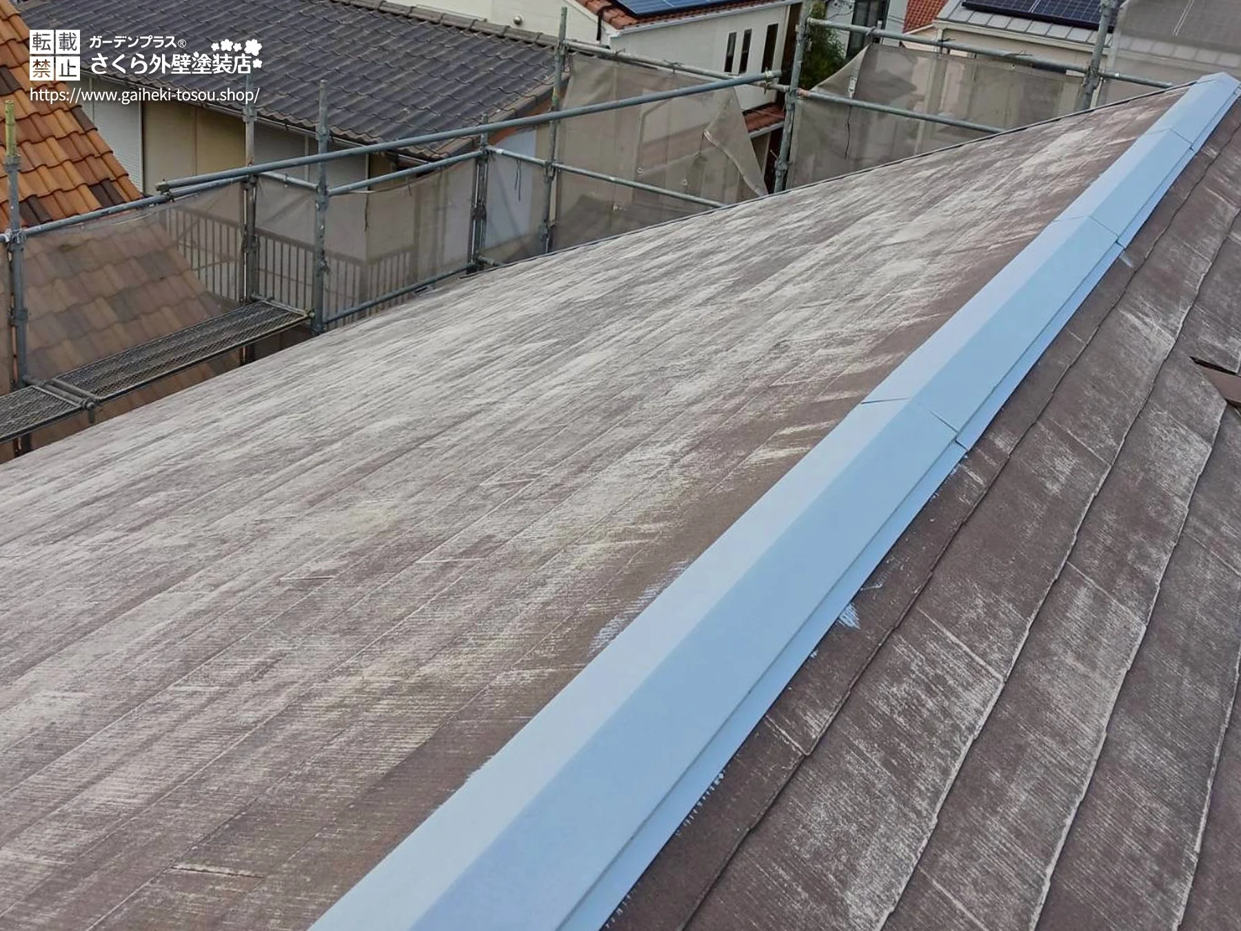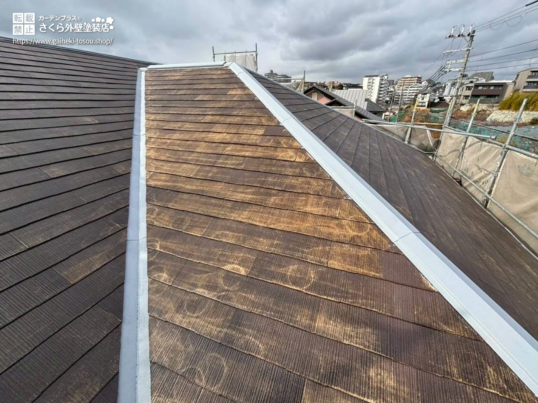 屋根には、日本ペイントの「グランセラベスト2液ファイン」を使用。優れた高耐候性で、美しい色彩と光沢を長期間維持します。さらに防藻・防かび性を備え、屋根を長く清潔に保ちます。