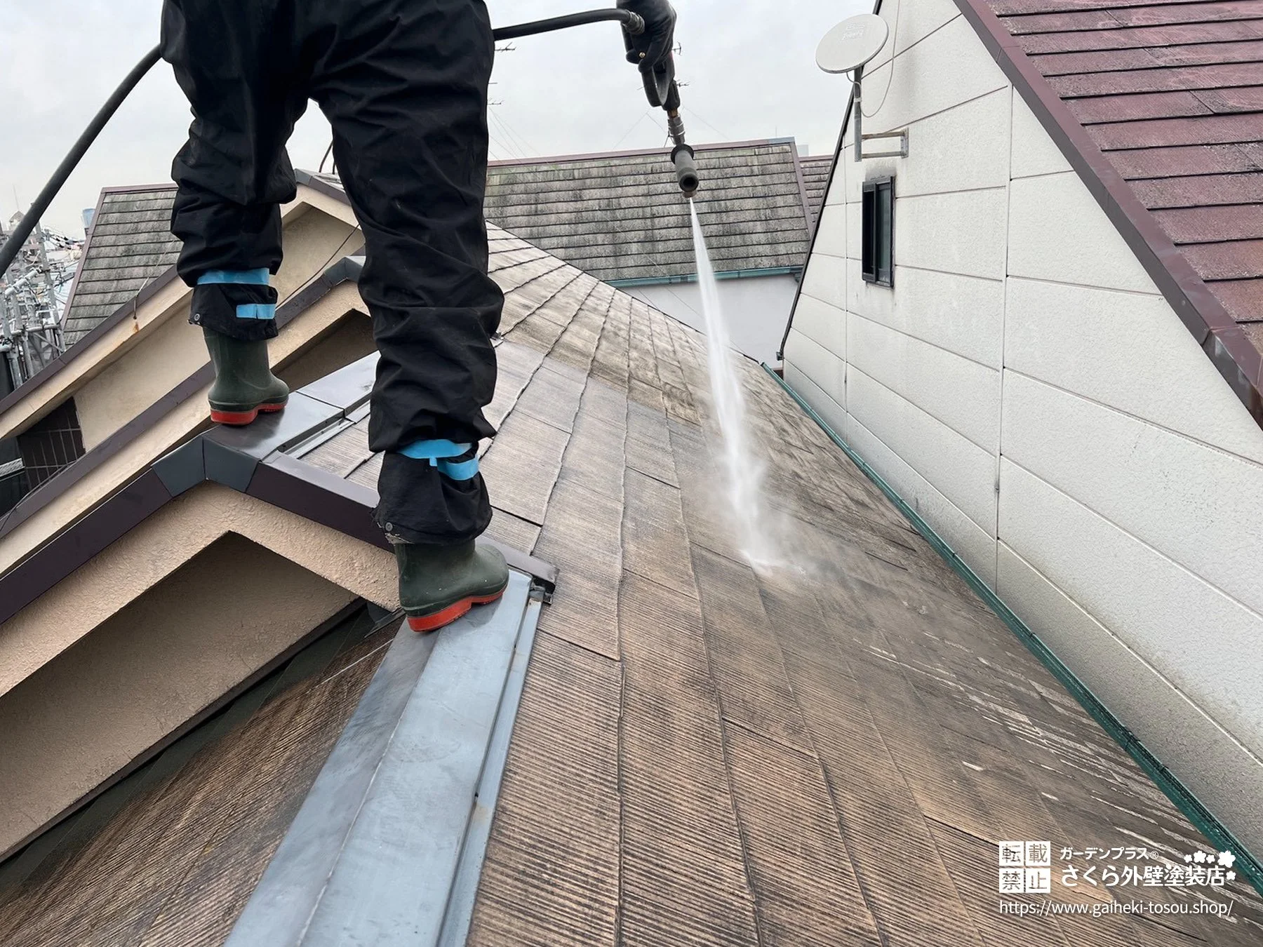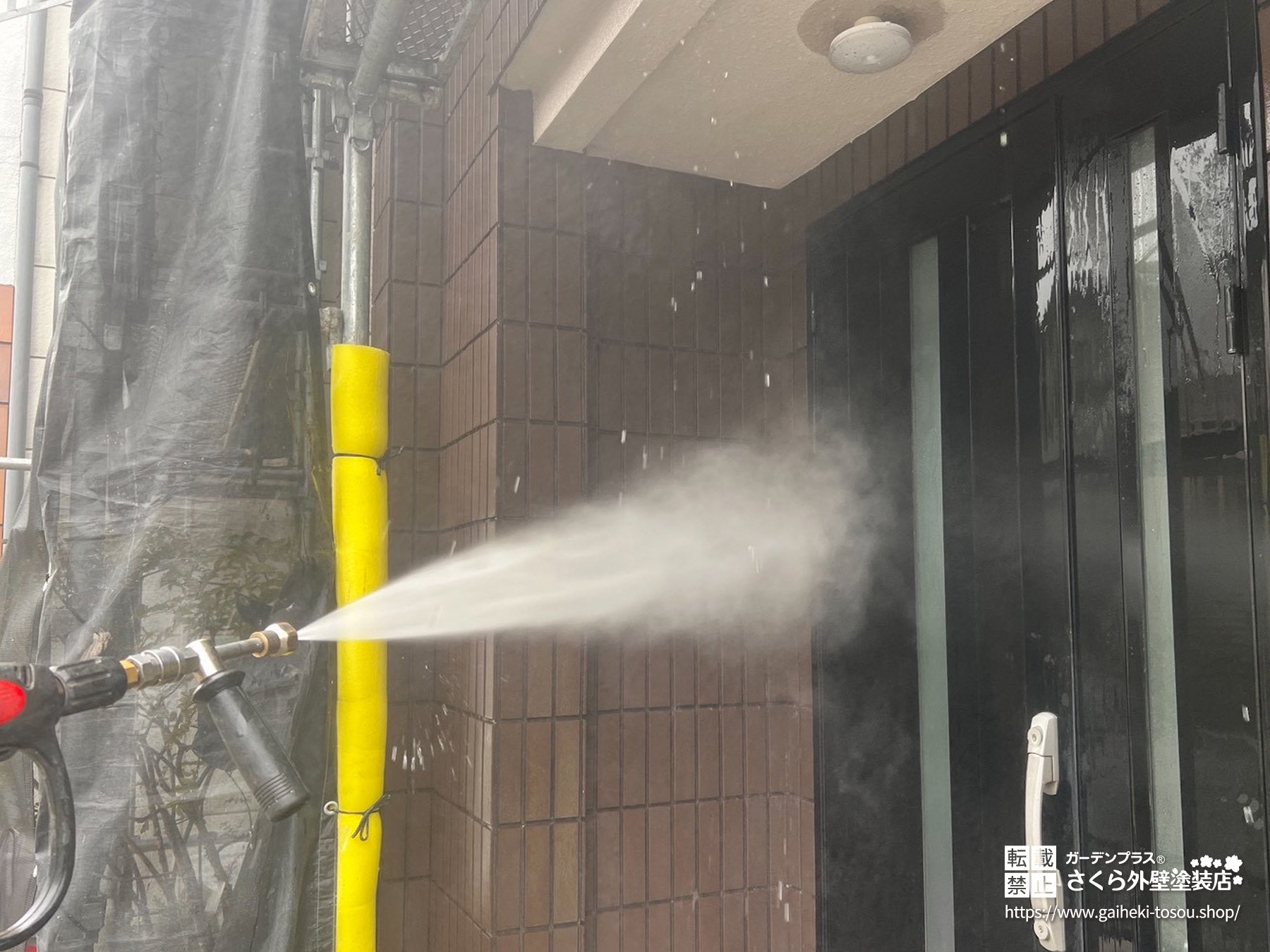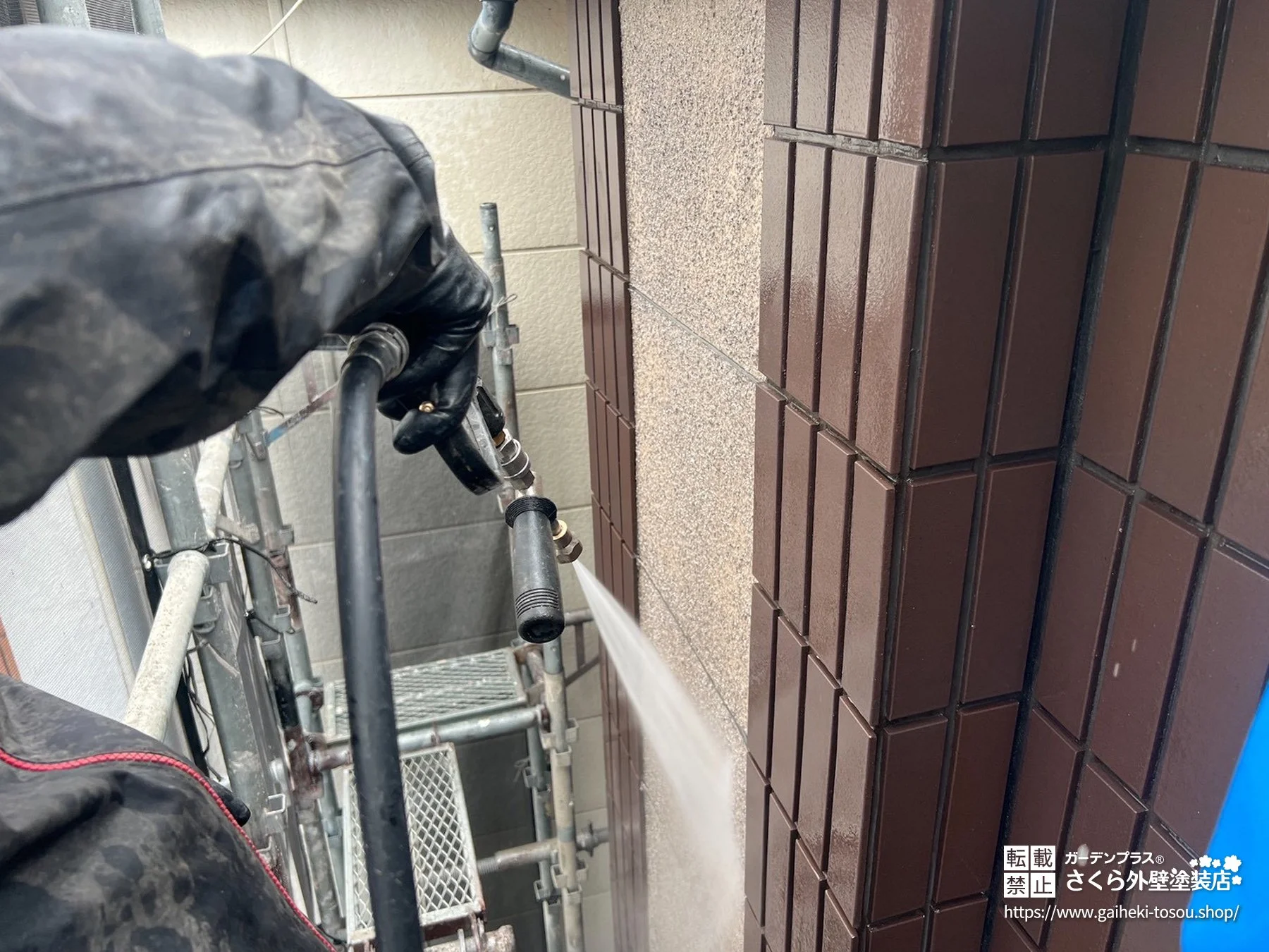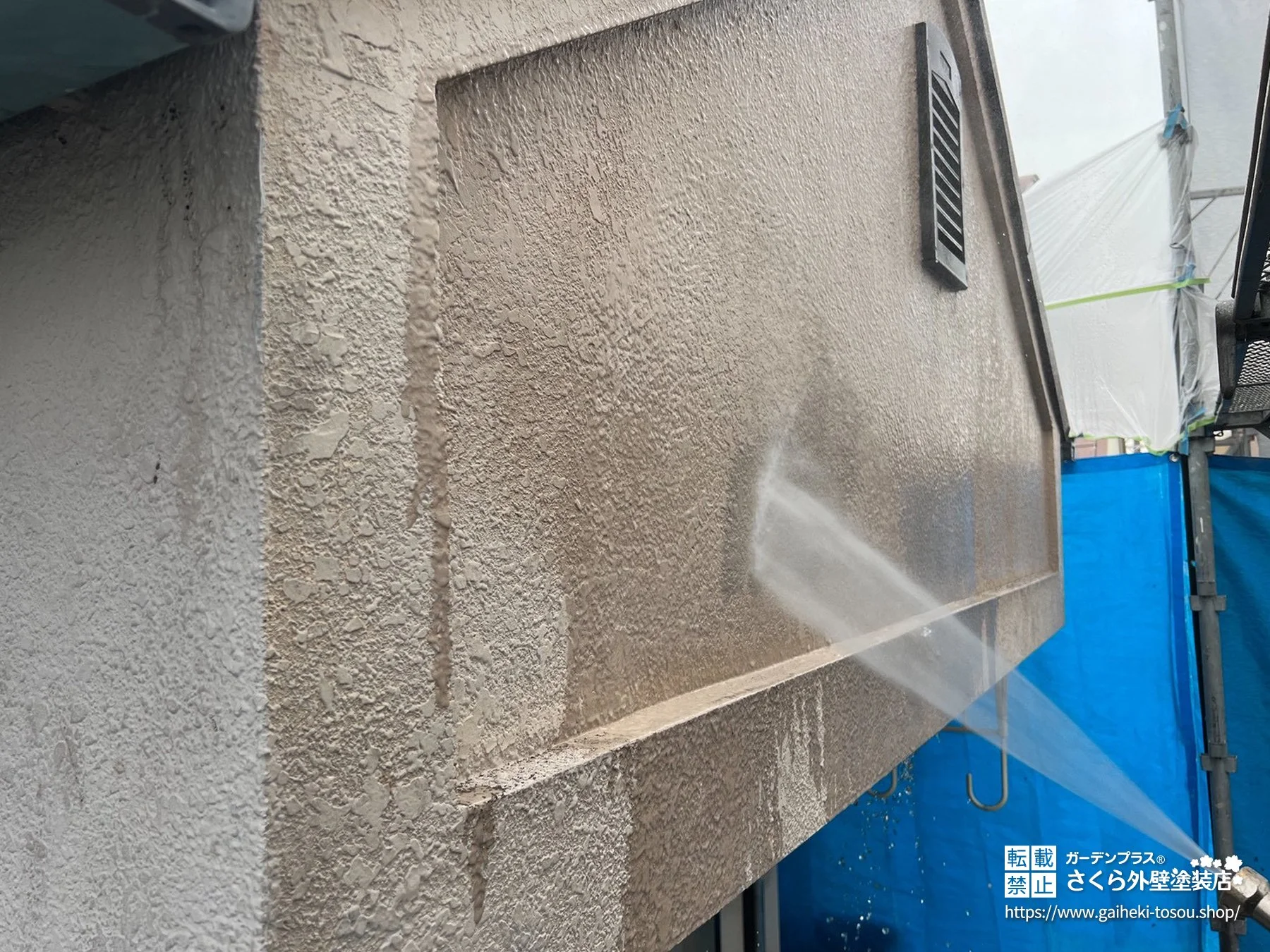 古い塗膜や表面に生えたカビやコケ、汚れなどが残ったままだと、新たな塗膜が十分な性能を発揮できないため高圧洗浄にて洗い落とします。