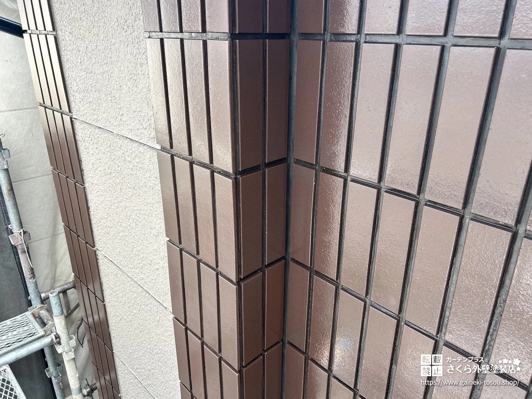 外壁のタイル面には、日本ペイントの「グラッシーガード」を使用し、モルタル目地からの水の侵入を抑制。外観の風合いを損なうことなく、美観の維持に配慮した仕上がりになりました。