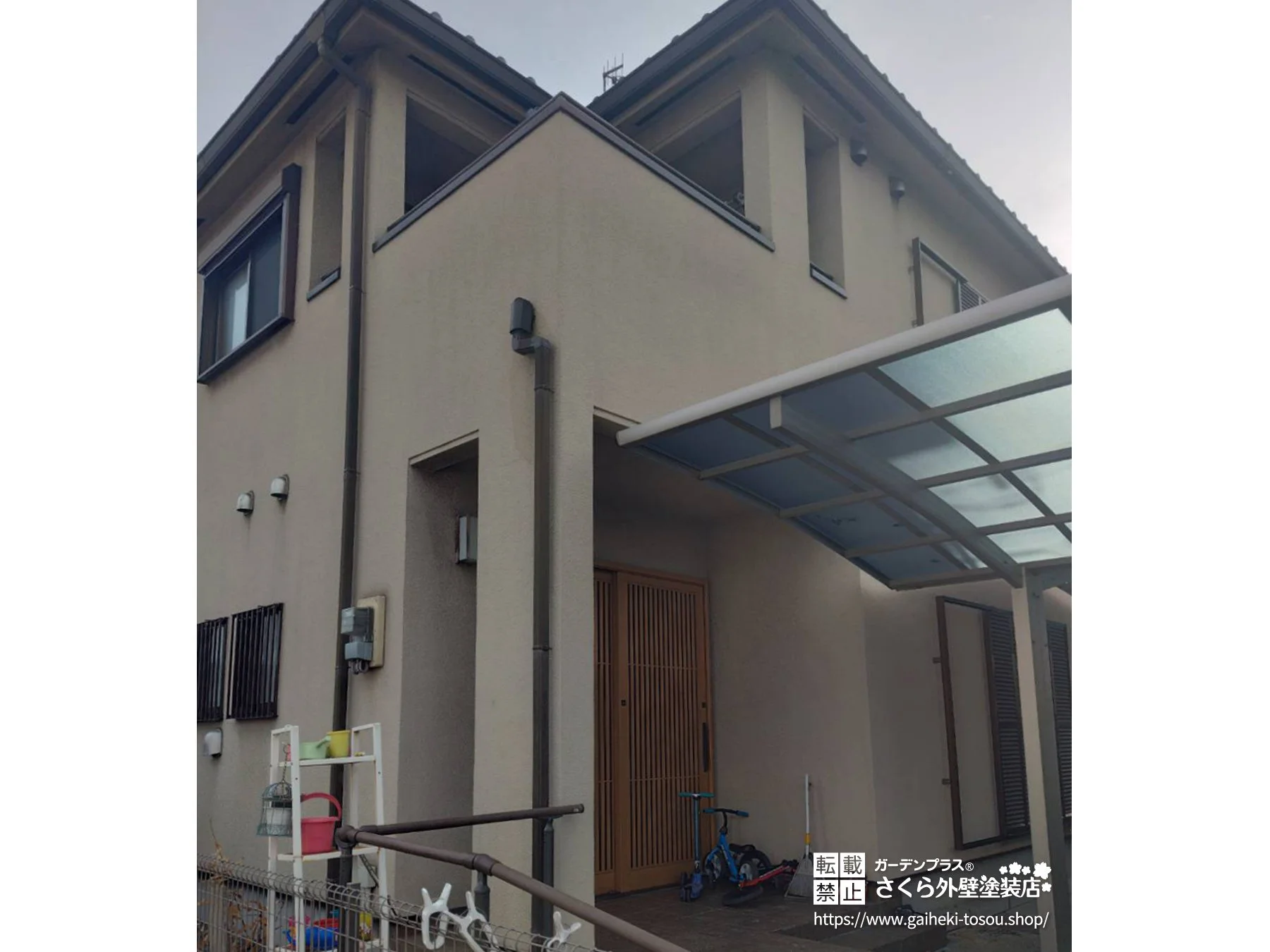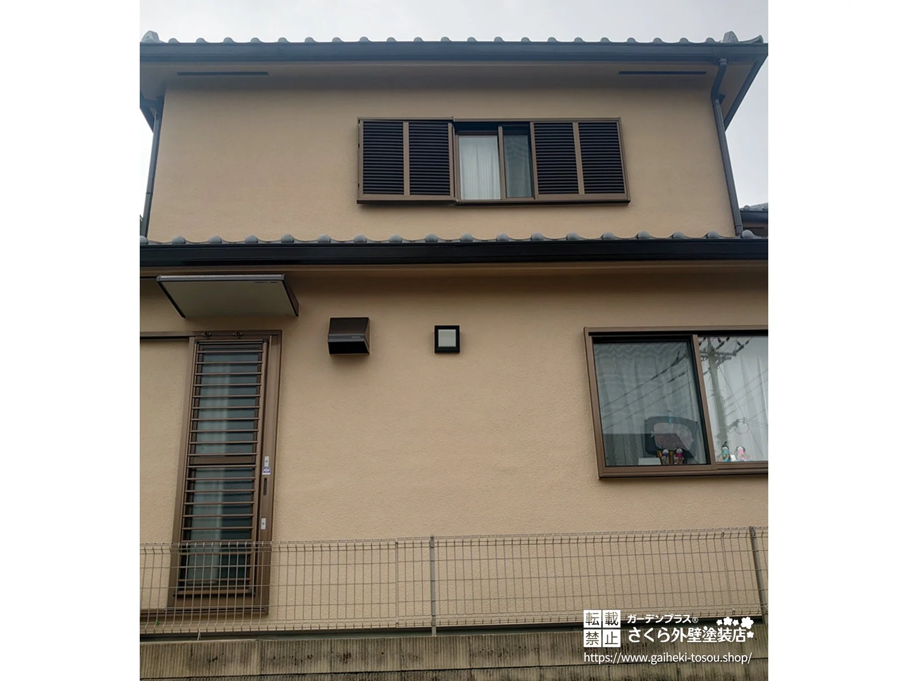 カラーは落ち着いたベージュ系を採用し、和風住宅の趣に調和した上品でやわらかな印象に。経年により黒ずみが目立っていた外壁が、明るく清潔感のある外観へと生まれ変わりました。