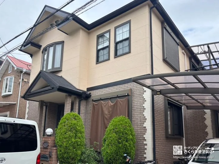 元々ベージュとレンガ調の外壁デザインだったお住まいに、ベージュ部分には「グランセラ™トップ 1液水性」の無機塗料を採用。レンガ部分には「UVプロテクトクリヤー」を塗装しました。