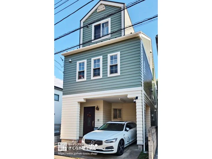 落ち着きのあるグリーンが主張しすぎることなく、付帯部のホワイトとも自然になじみ、建物全体が統一感のある仕上がりに。上下のコントラストが程よいメリハリを生み、やわらかさと清潔感を兼ね備えた印象となりました。
