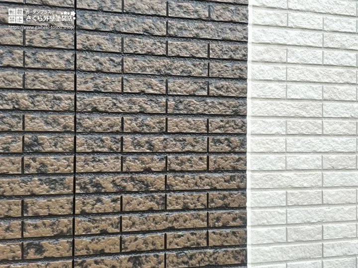 外壁のタイル調部分にはシリコンクリア特殊塗装を採用。既存デザインを活かすクリア塗装のため、元の外壁の印象を保ったまま耐候性を高めた仕上がりに。