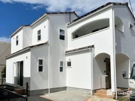屋根には、切妻屋根を採用しています。ダークブラウンの瓦屋根が、建物にメリハリを与え全体が引き締まった印象に。また、軒天と破風板にはホワイトカラーを使用し、清潔感のある外観に仕上がっています。