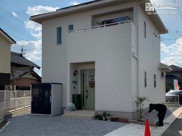新築外構工事を承りました。家庭菜園をされたいとのことで、主庭の一部を化粧ブロックで囲って花壇にし、お庭に面した掃き出し窓にはウッドデッキを設置しました。主庭から犬走は圧迫感のないシルバーの外周フェンスで囲っています。駐車スペースと道路の境界部分は排水とお車の出し入れがしやすいよう、勾配がついた土間コンクリートを打設して舗装しました。