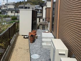 勝手口まわり:防草シート + 川砂利 + 山砂