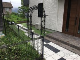 お庭のリフォームを承りました。なだらかな傾斜の駐車スペースには土間コンクリートを打設し、玄関前のアプローチやお庭に続く園路には白いタイルを敷設。お庭には人工芝を敷いて花壇を作り、白いタイルデッキを設置しました。清潔感あふれるタイルを使ったお庭リフォームです。