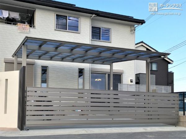 シルバーで統一されたスタイリッシュなカーポートとカーゲート