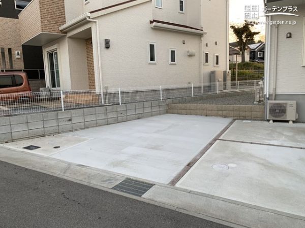 アプローチや駐車スペース1台分のみ土間コンクリートが打設されていましたが、アプローチ脇や2台目の駐車スペース分も土間コンクリートを打設して、ファサードを広く使えるようにリフォーム。既存部分との間に設けたスリットがデザインになりました。門まわりはレンガで舗装し、ナチュラルな彩りをプラス。お車や自転車も乗り入れしやすいお庭リフォームです。