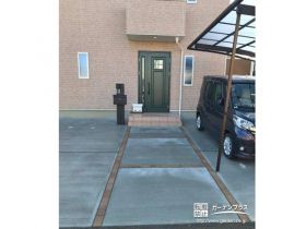 新築のお住まいの外構工事をご依頼いただきました。ファサードは予備駐車スペースにも使えるように全面土間コンクリートを打設。いつもお使いの場所にはカーポートを設置し、災害時に心強い着脱式サポート柱を追加しました。玄関前にはレンガ風のコンクリートブロックで目地を入れ、アプローチらしい雰囲気に。また主庭側には雨や花粉の季節に重宝するテラス囲いを施工させていただきました。汎用性が高く、使いやすい設計の外構です。