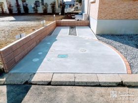 新築のお住まいの駐車スペースと玄関ポーチ階段の施工を承りました。道路に向かって勾配のある敷地でしたので、土砂の流出を防ぐため、駐車スペースには出入口に土間コンクリートを打設。またその他の土部分も砂利を敷き詰めて、泥が流れないように配慮いたしました。ポーチ階段は一番下の段だけコンクリートとレンガを使い、駐車スペースとリンクさせたデザインにして、ファサードに統一感を持たせています。アールを使ったラインで、可愛らしいデザインポイントができました。