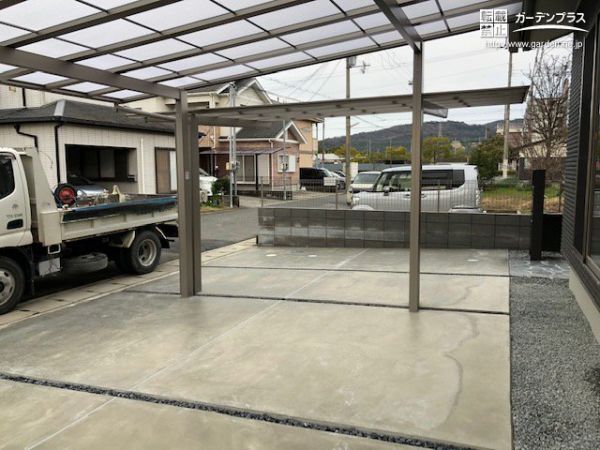 駐車スペース:土間コンクリート + カラー砂利目地 黒 + 伸縮目地