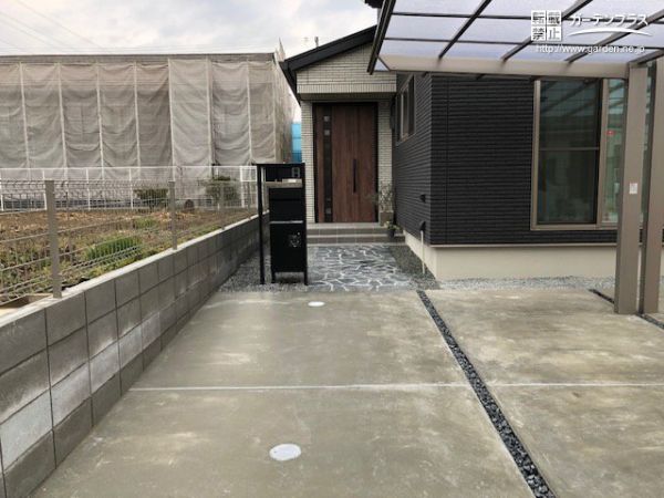 新築のお住まいの外構工事をご依頼いただきました。ファサードは全面土間コンクリートを打設し、シングルとワイドのカーポート2棟を設置。ご来客があっても広々と使えます。アプローチには目地が美しく浮かび上がる黒い乱形石を貼りました。生活に寄り添い、落ち着きとモダンさを感じさせる新築外構です。