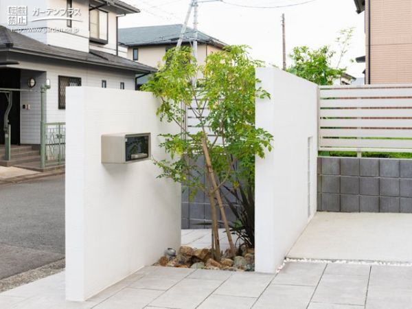 新築外構一式工事を承りました。ホワイト×ダークグレーのモダンな住宅に合わせて、ファサードはモノトーンで統一。存在感のある大きな門柱からはシマトネリコを覗かせ、緑の瑞々しさも外構デザインの彩りとして取り入れました。フェンスの基礎の擁壁や主庭のデザイン塀など、既存のものを再利用しつつ、美しいお庭の要素として昇華させた新築外構デザインです。