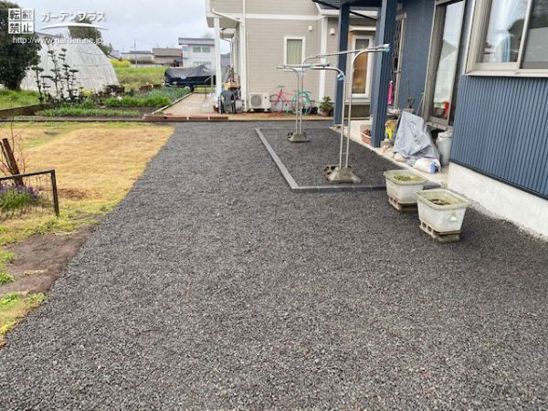 雑草対策をしたいとご依頼をいただきましたが、現場調査におうかがいしたときに水はけの悪さにお困りだったので、予算内で収まるように、暗渠排水を作っての対策をご提案しました。使う部材は砂利だけながら、地面の高低差を利用して排水性をアップさせます。洗濯物を干されるテラスまわりも高さを使って、足元が乾きやすいように施工しました。