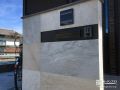 門柱:コンクリートブロック積 + タイル貼り ニッタイ ストーンクォーツ + 裏面ジョリパッド仕上げ + 笠木 東洋工業 ラッジキャップ