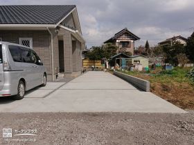 お隣にご親戚が住まわれており、母屋と行き来ができるような新築外構をご希望いただきました。広い敷地でしたので、まずは行き来を安全にしていただけるように生活スペースの舗装を最優先に。砂利やブロック塀等は将来コンクリートやフェンスを施工する際にも使えるようにプランニングしました。