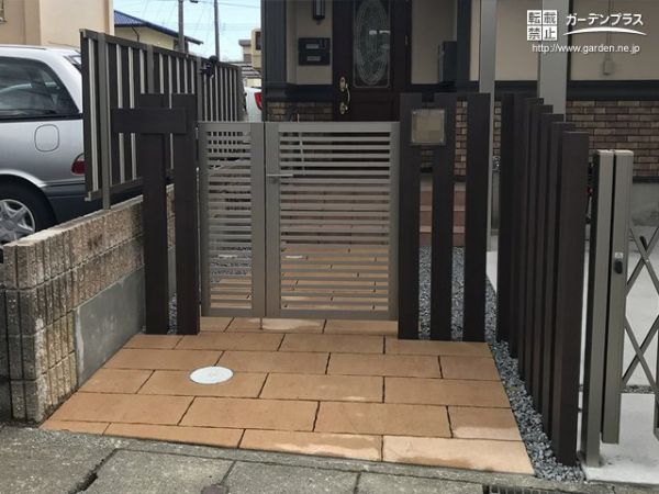 オープン外構からクローズ外構へリフォームしました。駐車スペースにはカーゲート、玄関側には門扉を設置し、隙間を角柱で埋めて、圧迫感のないクローズ外構をプランニング。お住まいに合わせた木目調カラーと、エクステリアの金属色をバランス良く使い、お住まいにも調和するモダンなファサードへリフォームすることができました。