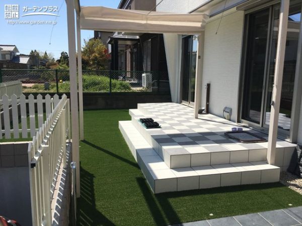 新築のお住まいでフェンスや砂利敷、立水栓などを取り付けられていたものの、わんちゃんをお庭で遊ばせたいとのことでタイルデッキやパーゴラをご希望いただきました。ご要望をおうかがいし、独立式のフレームとタイルデッキ、人工芝の緑を使った爽やかでエレガントな外構プランをご提案。フレーム・ポーチにはシェードを取り付け、夏も陽射しをコントロールできます。