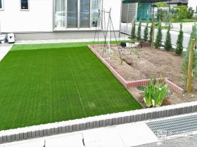 駐車スペースに土間コンクリートが打設されていましたが、それ以外は新築時のままだったお住まいの外構リフォームをご依頼いただきました。敷地のまわりには土留めも兼ねた境界ブロック塀を設置し、主庭は家庭菜園スペースを設け、人工芝を敷設。勝手口まわりには道路からの視線をカットするため目隠しフェンスを設けました。ライフスタイルに合わせ、生活しやすく整えたお庭リフォーム工事です。