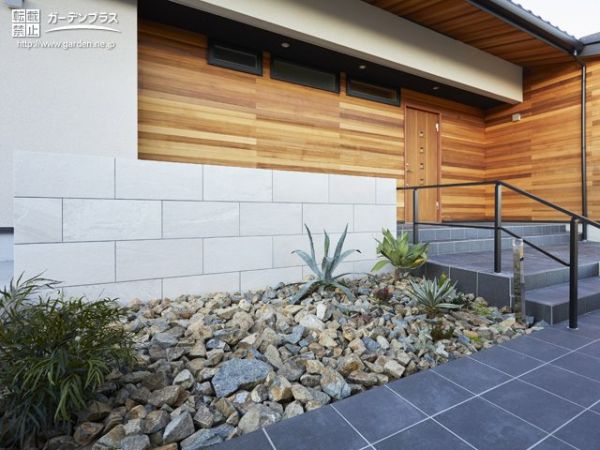 玄関まわりを施工しました。アプローチから玄関ポーチまでは同じタイルで造作し、深みのある黒で高級感を演出。お客様を視覚でおもてなし出来るよう、割栗石を敷いた植栽スペースでロックガーデン風に仕上げました。
