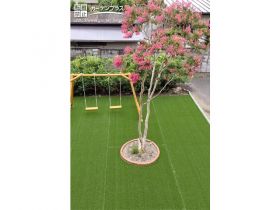 枯れ木や不要な植栽を撤去・伐根したいとご依頼をいただき、お庭の不要な木や雑草を処分して綺麗に整地。上から防草シートと人工芝を敷設し、すっきりとした明るい空間へリフォームしました。中央の見事なサルスベリは残し、足元をレンガで囲って植栽スペースに。お子様を遊ばせても安心なお庭です。