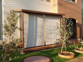 テラス屋根:LIXIL シュエット チェリーウッド + 熱線吸収ポリカーボネート屋根 + 可動竿掛け(着脱式)オータムブラウン