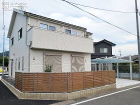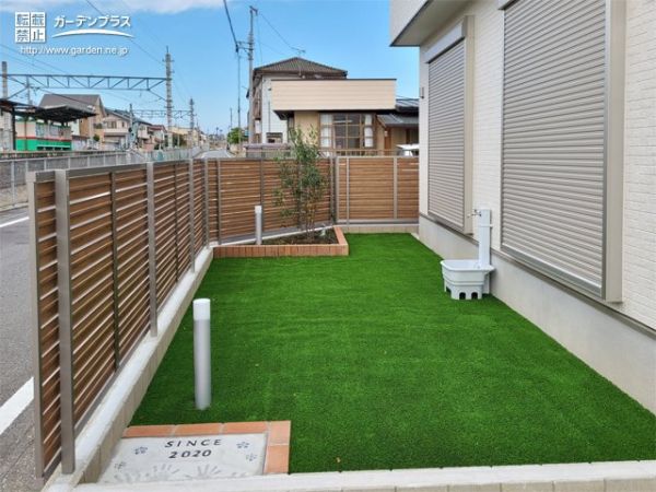 新築外構一式工事を承りました。土のままの主庭にはお庭らしい雰囲気を手軽に再現できる人工芝を敷設。下地には防草シートを使用し、雑草対策も万全です。主庭の一角にはご家族の手形を記念として残し、大切な思い出を形として残しました。