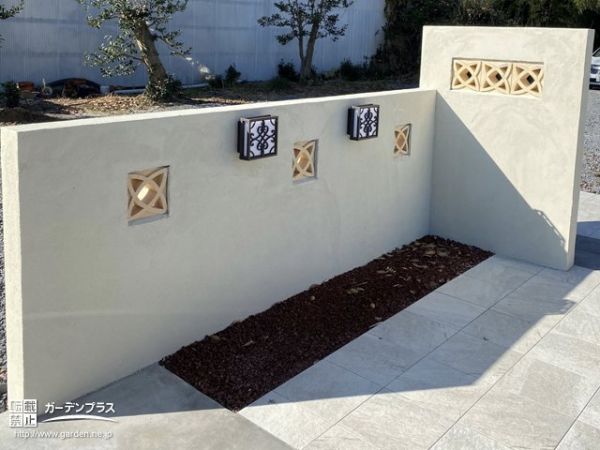門柱・袖壁・目隠し塀:躯体コンクリートブロック + 塗装仕上げ 四国化成 美ブロシルキー + 化粧ブロック オンリーワン ポーラスブロックフラワー ハニワ
