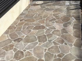 リビングの前のテラスをコンクリートで舗装してほしいとご依頼をいただき、コンクリートだけでは味気ないので乱形石を貼りました。天然石を組み合わせて下地となるコンクリートに貼り付けていく舗装のひとつで、複雑な形の組み合わせと石板の色で華やかな仕上がりになります。