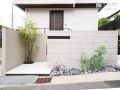 門柱前植栽スペース:ゴロタ石 + 低木寄せ植え