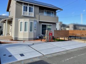 コンサバトリーのように飛び出した多角形スペースの形状が特徴的な、新築のお住まいの外構工事をご依頼いただきました。広いファサードの前方は土間コンクリートで舗装して広々と使える駐車スペースに。建物側のテラスまわりは木目調の樹脂フェンスで囲ってプライベートなお庭に整えています。多角形スペースを回り込むように曲線のアプローチを施工。植栽スペースをたくさん設けつつも、防草シートや瓦チップで雑草対策も施しました。お客様から支給いただいた赤いポストも景観のポイントになる新築外構です。