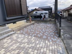 駐車スペース拡張のため、丈夫なインターロッキングブロックでお庭を舗装しました。予備の駐車スペースとしてご利用いただけるほか、テラスとしても楽しんでいただけ、雑草の心配もありません。既存の駐車スペースも土間コンクリートを打設しなおし、玄関前のアプローチスペースは4色のコンクリート平板を敷設しました。様々な色を使っていますが、全体的に抑えたカラートーンとなっているので、カラフルでも優しい印象の駐車スペースに仕上がっています。