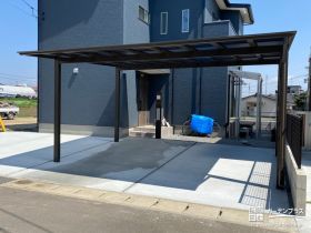 新築のお住まいの外構工事をご依頼いただきました。広いファサードは土間コンクリートを全面打設し、余裕のある駐車スペースに。また竿掛けが設置された掃き出し窓にはウッドデッキやテラス屋根を設け、洗濯物や室内の様子がお隣の視界に入りにくいように目隠しフェンスも設置しました。裏の隣地境界にはメッシュフェンスをブロック上に設け、セキュリティに配慮。安心して新居で生活をスタートできる新築外構です。
