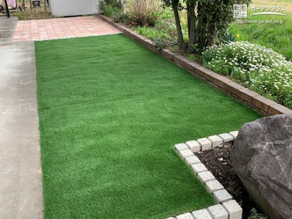 主庭のローメンテナンス化をご希望いただき、人工芝とテラスを施工しました。お手入れいらずで一年中緑が楽しめる人工芝スペースは、ふかふかの踏み心地に。また洗濯物を干したり、ティータイムを楽しめるテラスは、美しい色や表情豊かな天然石を貼って仕上げました。草むしりに時間を取られることなく、家事やガーデニングをしながらゆっくり過ごせるお庭リフォームです。