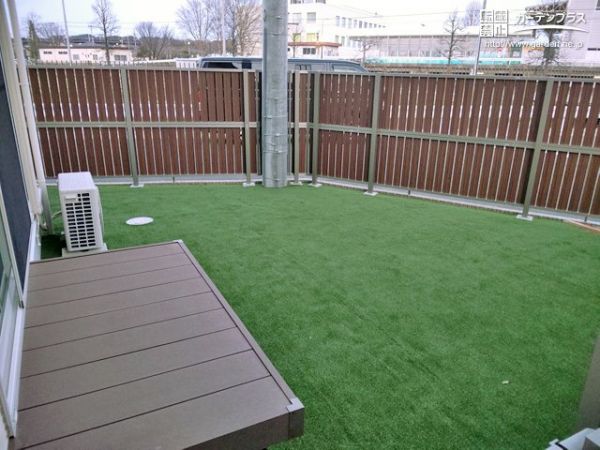 道路の角にあたる予備の駐車スペースを、お子様と遊べるお庭へリフォームしました。お庭にはクッション性の高い人工芝や砂場を施工し、掃き出し窓には小さなウッドデッキも設けて、気軽に外に出られるように。お庭の周りは木目調のフェンスで囲い、門扉も設置してクローズにしました。道路からの視線や駐車スペースへの車の出入りを気にせず、安心してお子様と遊べる明るいお庭です。